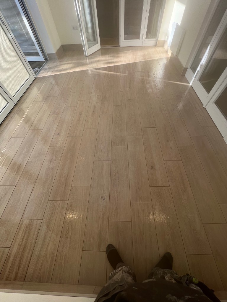 Beautiful wood affect floor tiled on a 70/30 bond . Job well done ✅